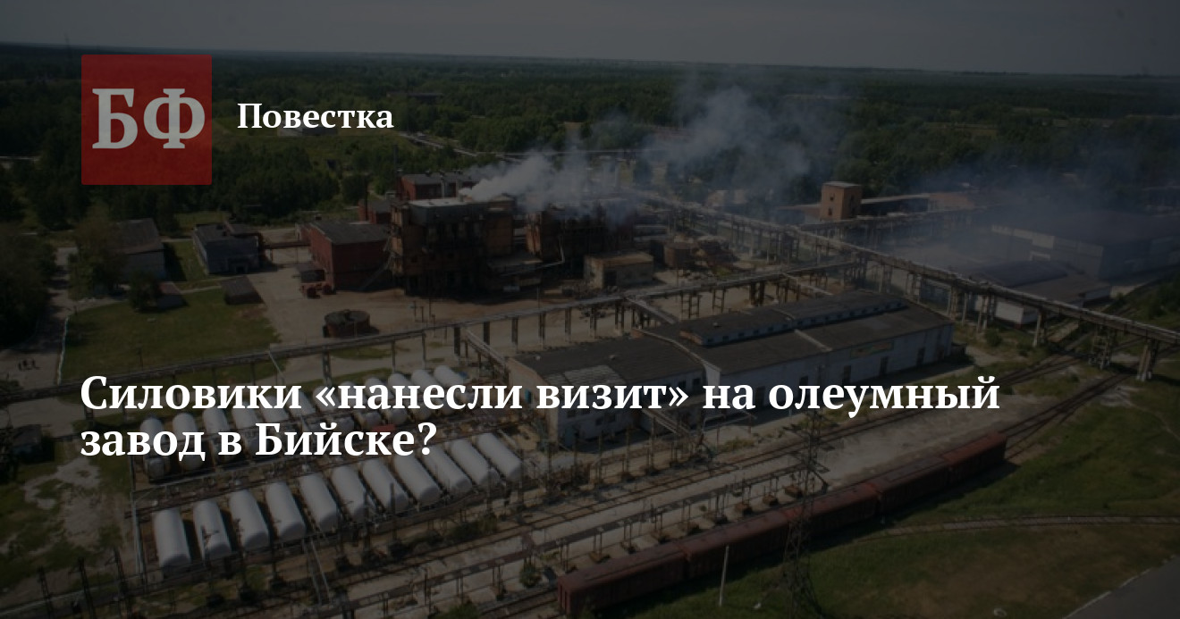 На Бийском олеумном заводе (БОЗ), входящем в структуру дзержинского ФКП «Завод имени Я.М. Свердлова», по сообщениям источником ИА «Банкфакс», 12 сентября работали силовики. По имеющимся данным, интерес к предприятию будто бы проявили сотрудники полиции, однако в ГУ МВД России по Алтайскому краю агентству не дали комментарий по данной теме. Оперативный ответ не смогли предоставить и на самом заводе.