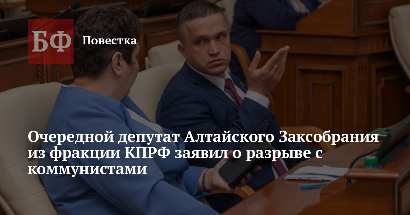 Ранее коммунисты «изгнали» из своего объединения в парламенте и из партии других депутатов — Елену Хрусталеву и Надежду Дрюпину. Поводом для этого, по объяснению крайкома, стала их одобрительная позиция по вопросу принятия проекта бюджета на 2023 год, которая шла вразрез с оппозиционной линией «зюгановцев». В разговоре с агентством обе заявляли, что не будут вступать в другие депутатские объединения и партии, хотя такое предложение на тот момент уже поступило им от «Коммунистов России». Хрусталева вскоре возглавила алтайское реготделение «Партии Пенсионеров».