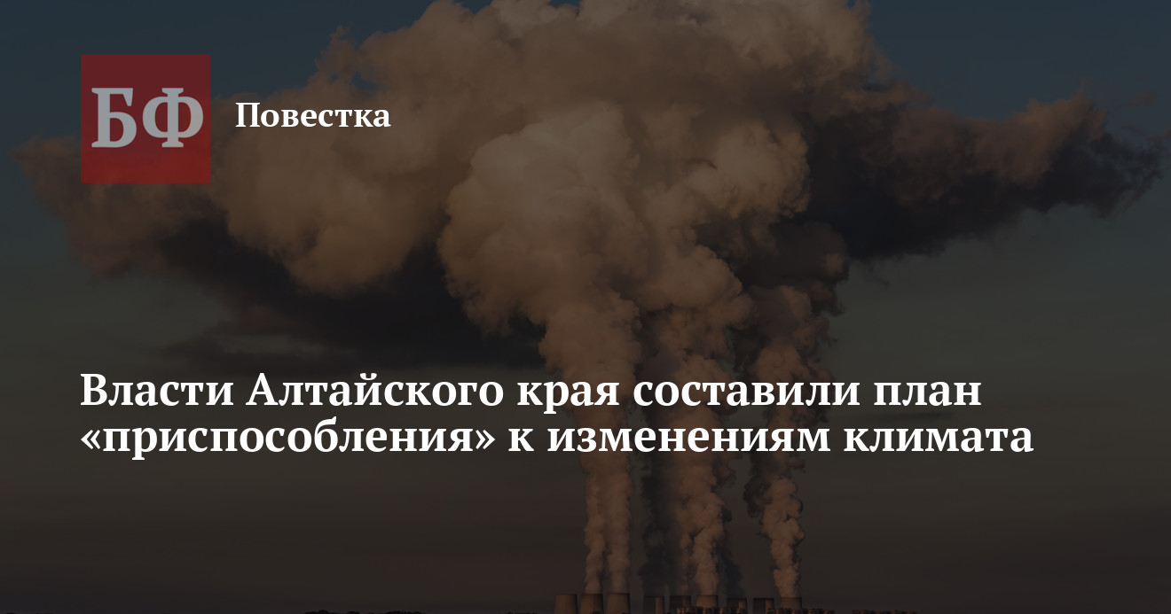 Распоряжение об утверждении регионального плана адаптации к изменениям климата в Алтайском крае датировано 20 ноября. Ранее пресс-служба Минприроды Алтайского края разъяснила, что в его основу лег Паспорт климатической безопасности региона. Это так называемый документ о состоянии «здоровья» субъекта, в котором определены риски негативного влияния изменяющихся природно-климатических условий. Научные исследования для подготовки Паспорта проводили в Алтайском государственном техническом университете им. И.И. Ползунова, для этого с вузом заключали госконтракт. К совместной работе были также привлечены ученые Института водных и экологических проблем Сибирского отделения Российской академии наук. Известно, что регионам следовало разработать проекты адаптации к изменениям климата в рамках нацплана, который появился в конце 2019 года.