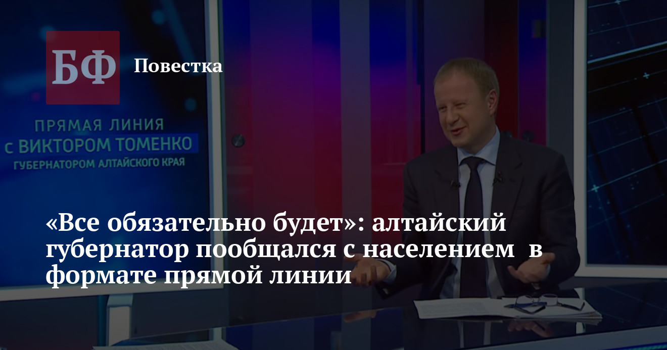 Добавим, что всего на прямую линию поступило порядка 2500 обращений. В ходе прямой трансляции, которая продлилась около двух часов, Виктор Томенко успел ответить более чем на 25 из них. «Дорогие друзья, уважаемые жители Алтайского края, я обещаю, что все они [вопросы] поступят в работу, примерно по такому подходу, который я сейчас сформулировал на примерах конкретных, будут рассмотрены. Постараемся их решать. Я вас искренне благодарю за внимание, за всю помощь, которую вы оказываете. Можете надеяться на нас — органы власти Алтайского края», — подытожил губернатор.