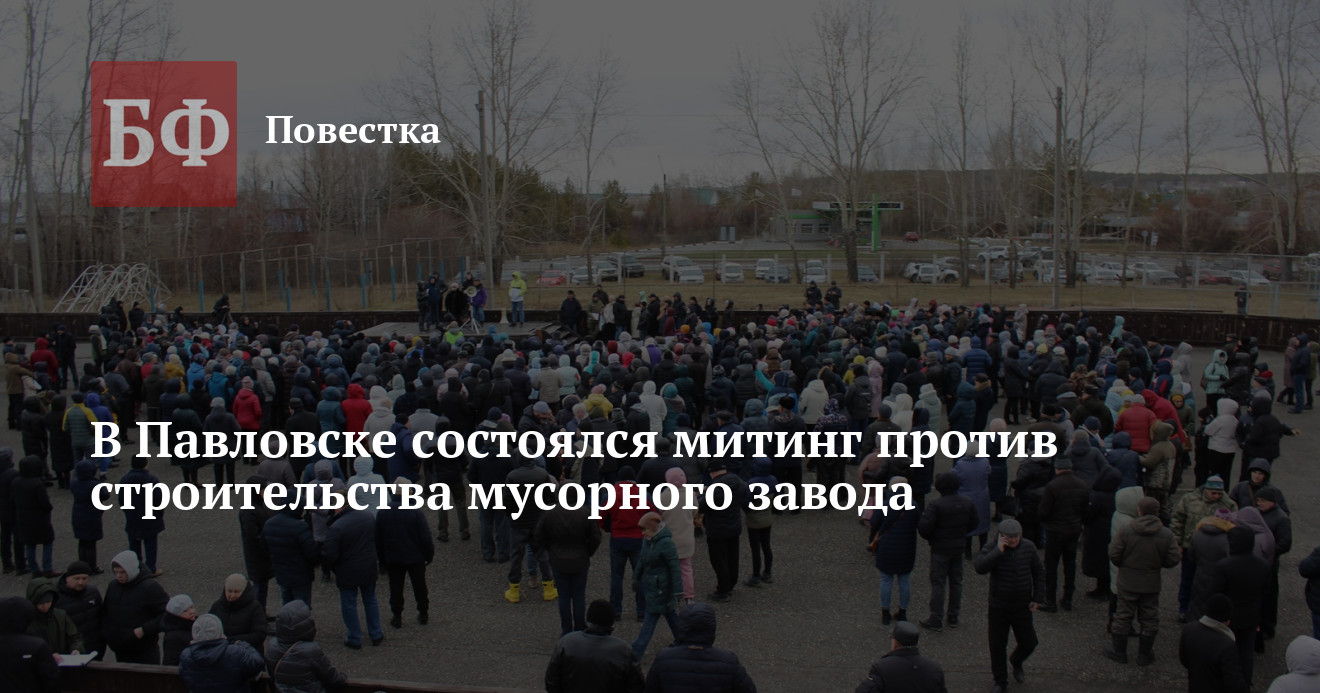 25 ноября в райцентре Павловского района состоялся ранее анонсированный митинг против возведения предприятия по переработке отходов между селами Павловск, Боровиково и Елунино. Акция прошла на территории гайд-парка — стадионе «Юность». Предполагалось, что численность участников не превысит 100 человек. Однако еще до начала митинга стало ясно, что людей будет гораздо больше. К этому времени на входе павловчан уже ждали сотрудники полиции, которые обеспечивали безопасность участников и досматривали всех на наличие опасных предметов. Организаторы сообщили правоохранителям, что митинг не политический, поэтому демонстрация никаких флагов, в том числе с символикой КПРФ, не предусмотрена.