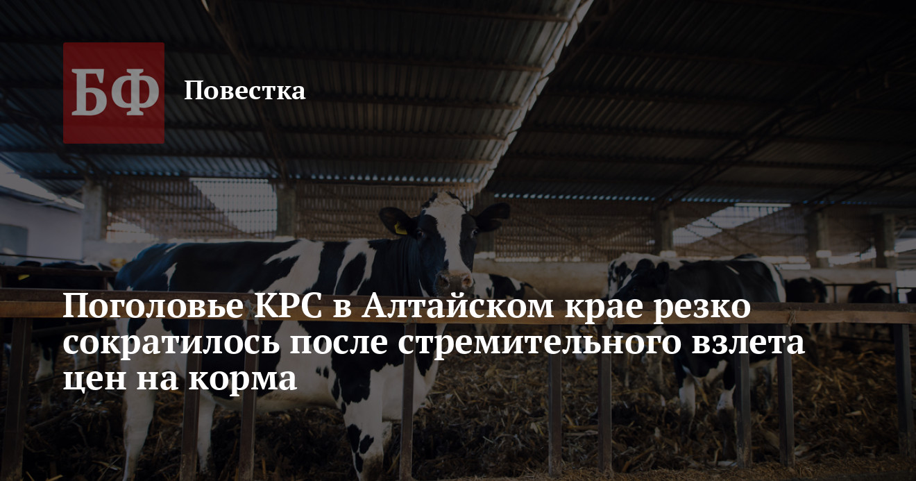В Алтайском крае в течение сентября и октября поголовье крупного рогатого скота сократилось на 22,2 тысячи голов, в том числе коров — на 6,3 тысячи. Это следует из данных, обнародованных региональным Минсельхозом. Между тем жители алтайских сел заявляют, что им приходиться вырезать скот из-за непомерных цен на корма — текущей осенью они выросли в несколько раз.