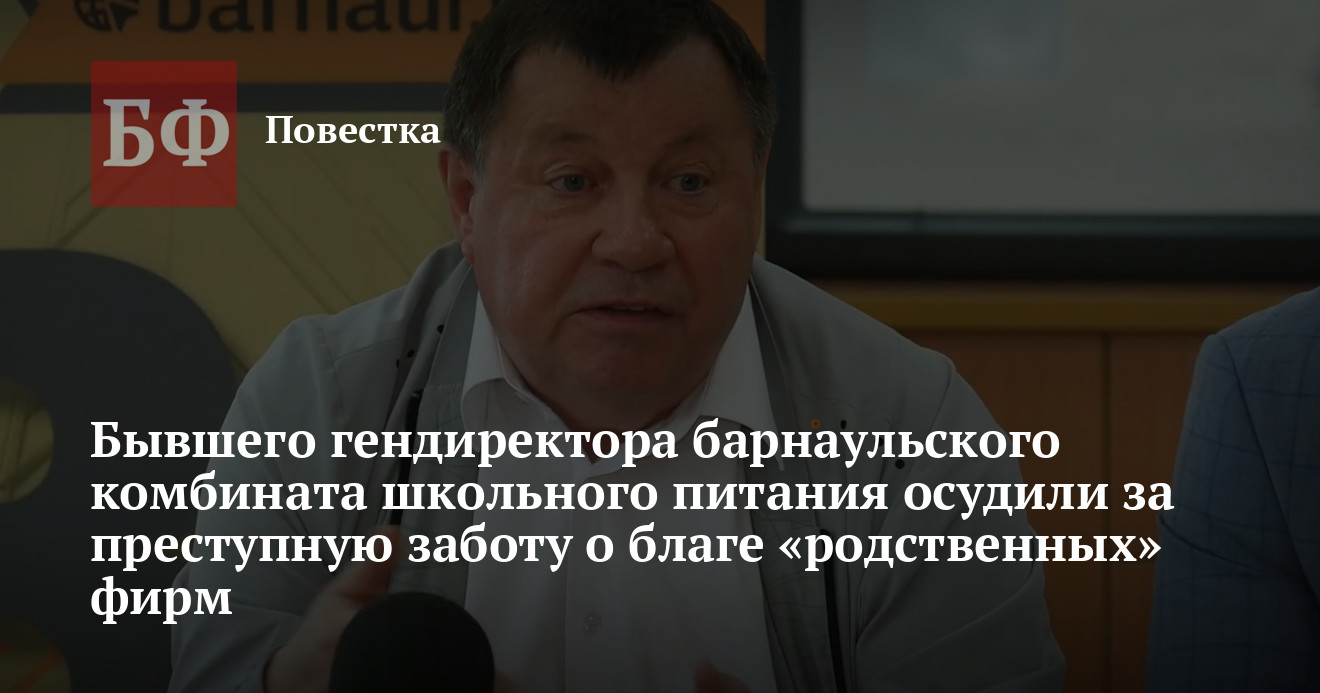 Индустриальный районный суд Барнаула 20 декабря вынес приговор по делу бывшего генерального директора муниципального АО «Комбинат школьного питания — Глобус» (КШП) Евгения Скурлатова. Его признали виновным в двух эпизодах превышения должностных полномочий — он сдавал помещения комбината компаниям, связанным с его родней. За это фигурант получил условный срок. Кроме того, с него постановили взыскать больше 8 млн рублей в счет возмещения убытков предприятия.