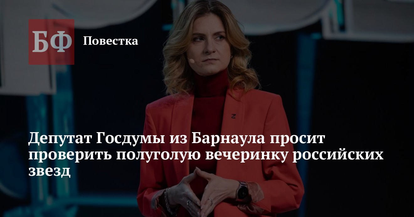 К ситуации также подключилась уроженка Барнаула, телеведущая и депутат Госдумы от Кировской области Мария Бутина. Она написала обращения в МВД, Минкульт РФ и Роскомнадзор. Политик попросила провести проверку и дать правовую оценку о наличии на этой вечеринке «признаков пропаганды нетрадиционных сексуальных отношений» и соблюдении указа президента «Об утверждении Основ государственной политики по сохранению и укреплению традиционных российских духовно-нравственных ценностей».
