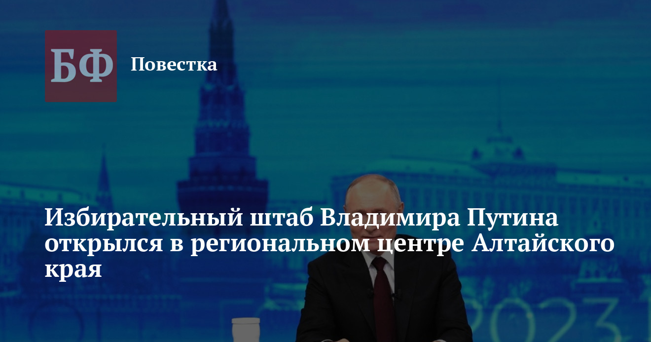 Избирательный штаб самовыдвиженца Владимира Путина заработал в Барнауле. Организация начала сбор подписей в поддержку его кандидатуры. Сопредседателями штаба стали начальник краевого госпиталя ветеранов войн Ольга Зубова, командир стрелкового взвода 3-й роты 37-й отдельной гвардейской мотострелковой бригады Юрий Жуланов и актриса Театра музкомедии Виктория Гальцева. Последняя уже была доверенным лицом Путина на выборах в 2018 году.