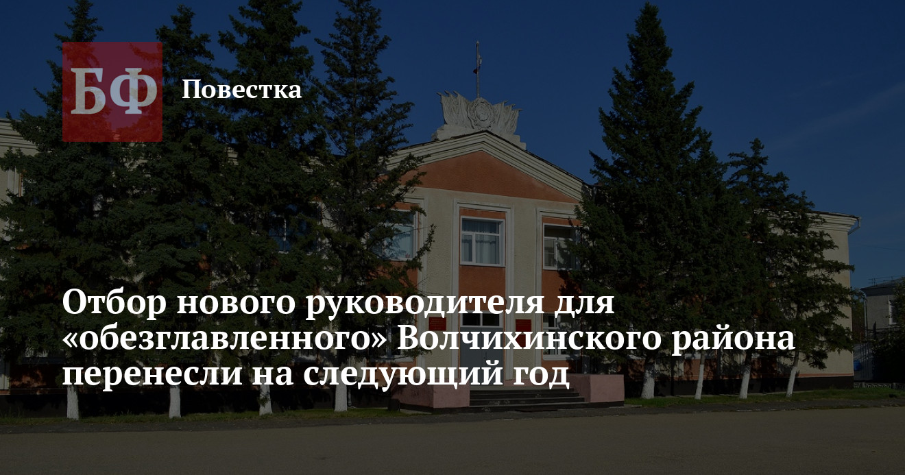 Конкурс по отбору кандидатур на должность главы Волчихинского района не завершится в текущем году, как планировалось изначально. Как рассказал «Банкфаксу» спикер Волчихинского райсовета Евгений Бауэр, даты проведения мероприятий пришлось сместить на следующий год из-за задержки с проверкой документов соискателей. В то же время источники агентства полагают, что документы уже изучены, а истинные причины задержки могут быть совсем иными.