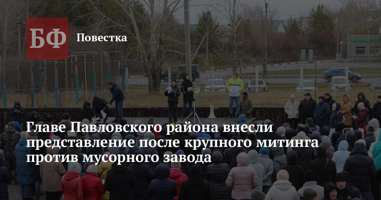 Ранее сообщалось, что жители Павловского района решили провести собрание на территории стадиона «Юность», чтобы обсудить ситуацию с возведением предприятия по переработке отходов. В уведомлении, адресованном администрации, отмечалось, что его может посетить до 500 человек. Власти не согласовали проведение мероприятия, так как здание на стадионе было повреждено после мощного урагана, а его последствия не ликвидировали.