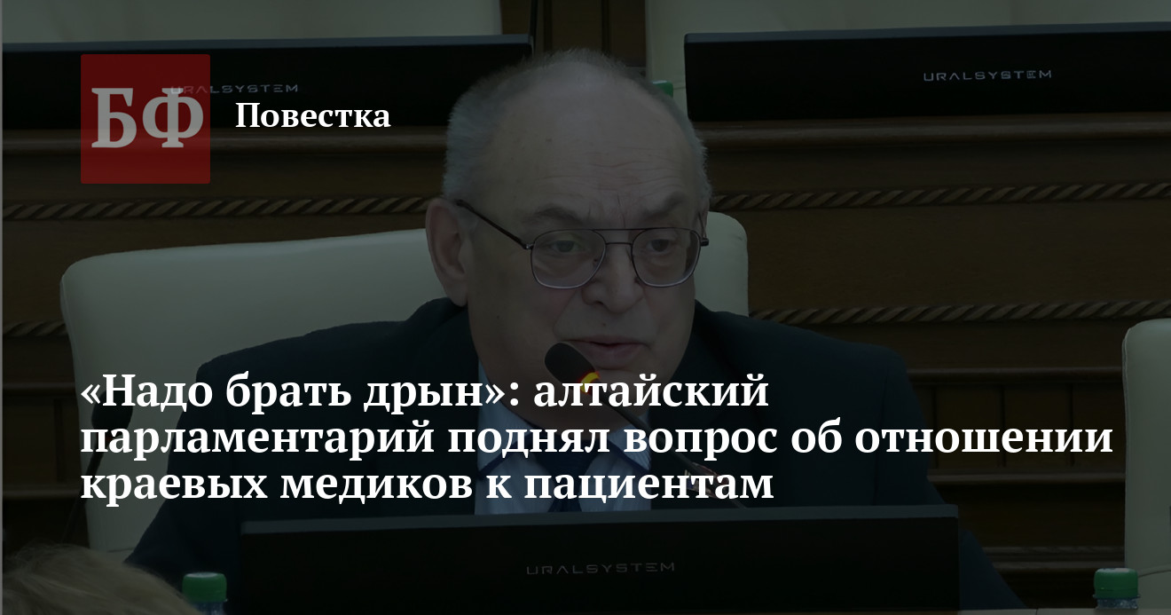 Депутат Алтайского Заксобрания Владимир Козловский на правительственном часе с главой регионального Минздрава обратил внимание на проблему неподобающего отношения местных медиков к пациентам. Он рассказал о собственном негативном опыте, утверждая, что в федеральных клиниках врачи совершенно иначе относятся к больным.