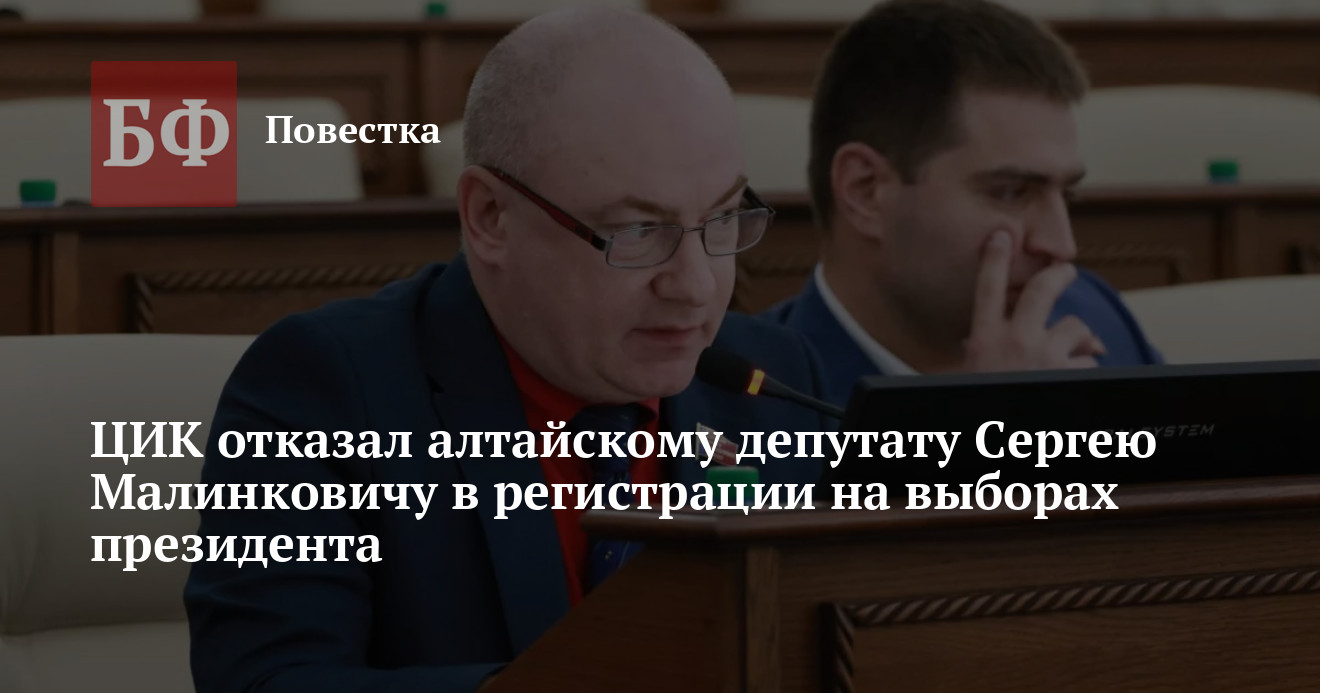 Депутату Алтайского Заксобрания, главе партии «Коммунисты России» Сергею Малинковичу отказали в регистрации в качестве кандидата на выборах президента РФ. Соответствующее решение 8 февраля принял Центризбирком.