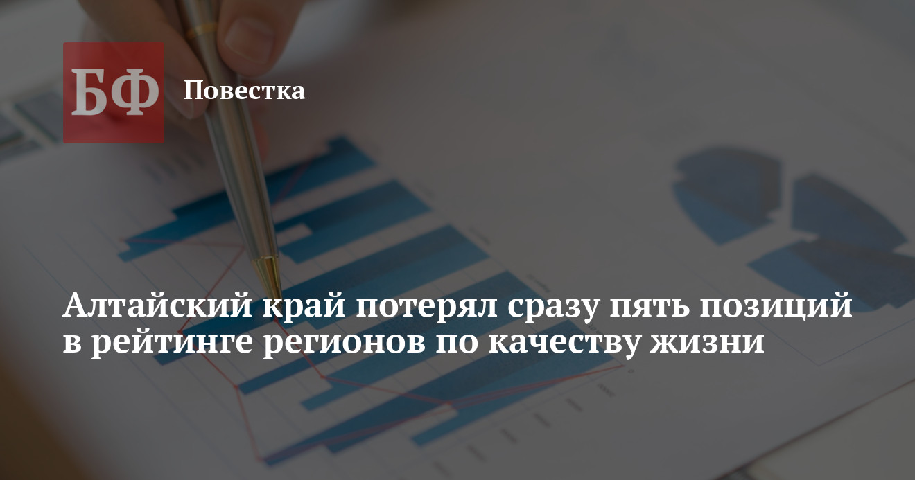Эксперты составили очередной рейтинг субъектов РФ по качеству жизни, в котором Алтайский край занял 69 место. Как следует из исследования РИА «Новости», это на пять позиций ниже, чем годом ранее.