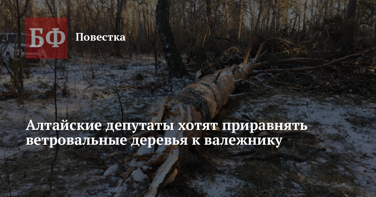 Вопрос о необходимости подготовки такого обращения на еженедельном оперативном совещании в краевом парламенте поднял председатель комитета по аграрной политике, природопользованию и экологии Сергей Серов. Он отметил, что сейчас к валежнику, который беспрепятственно могут собирать граждане, относят только части деревьев, отделившиеся от корня и лежащие на земле. Однако прошедшие в Алтайском крае ураганные ветры продемонстрировали проблему такого определения, поскольку оно не включает в себя ветровальную (буревальную) древесину — вывороченные деревья, часть корня которых осталась в земле.