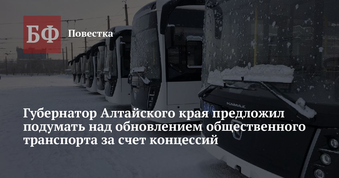 Власти рассмотрят возможность обновления общественного транспорта в муниципалитетах Алтайского края за счет концессионных соглашений и иных форм государственно-частного партнерства. Соответствующее заявление главы региона Виктора Томенко приводит пресс-служба правительства. Заметим, что параллельно с этим край решает те же задачи за счет средств казначейского кредита.