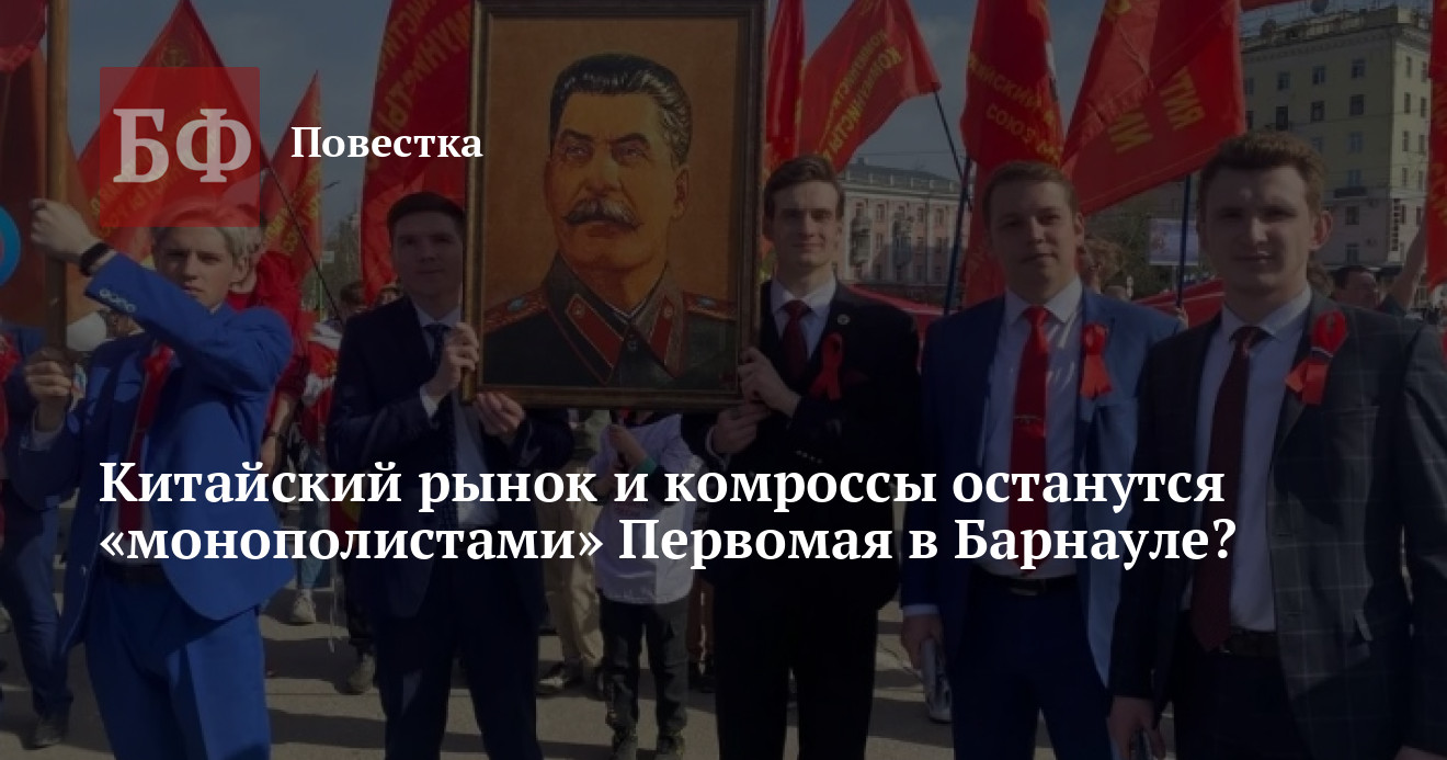 В то же время на рекламных конструкциях города стали появляться анонсы праздничного мероприятия, приуроченного к Первомаю, которое должно пройти на Китайском рынке. Ни в крайкоме КПРФ, ни в региональной организации профсоюзов об этом празднике не слышали. В то же время в текстах анонсов упоминается, что главным гостем праздника станут представители барнаульского «Сталин-центра» — детища краевых комроссов. Глава отделения КПКР в Алтайском крае, депутат АКЗС Сергей Матасов рассказал «Банкфаксу», что с ними связались организаторы праздника, пригласив партийцев в качестве почетных гостей. Связаны ли организаторы с собственниками рынка, Матасов не уточнил. Те же люди, по его словам, занимаются и размещением анонсов мероприятия на рекламных конструкциях. Всего Матасову известно о 10 таких объявлениях. Он также рассказал, что «Сталин-Центр» должен будет представить полноценную культурную программу на празднике. «У нас там планируется раздача красных лент как символа Первомая и значков со Сталиным. Будем поздравлять людей с майскими праздниками. Наши активисты будут участвовать и в качестве выступающих. Приедут наши товарищи из бийского казачества. С гармонью, естественно. Будут ребята и сольно выступать со сцены. Будем дарить людям настроение. Насколько мне известно, там в этот день предприниматели будут проводить свои акции, делать скидки на шашлыки, мясо и прочее, что пользуется спросом на майские праздники», — объяснил Матасов.