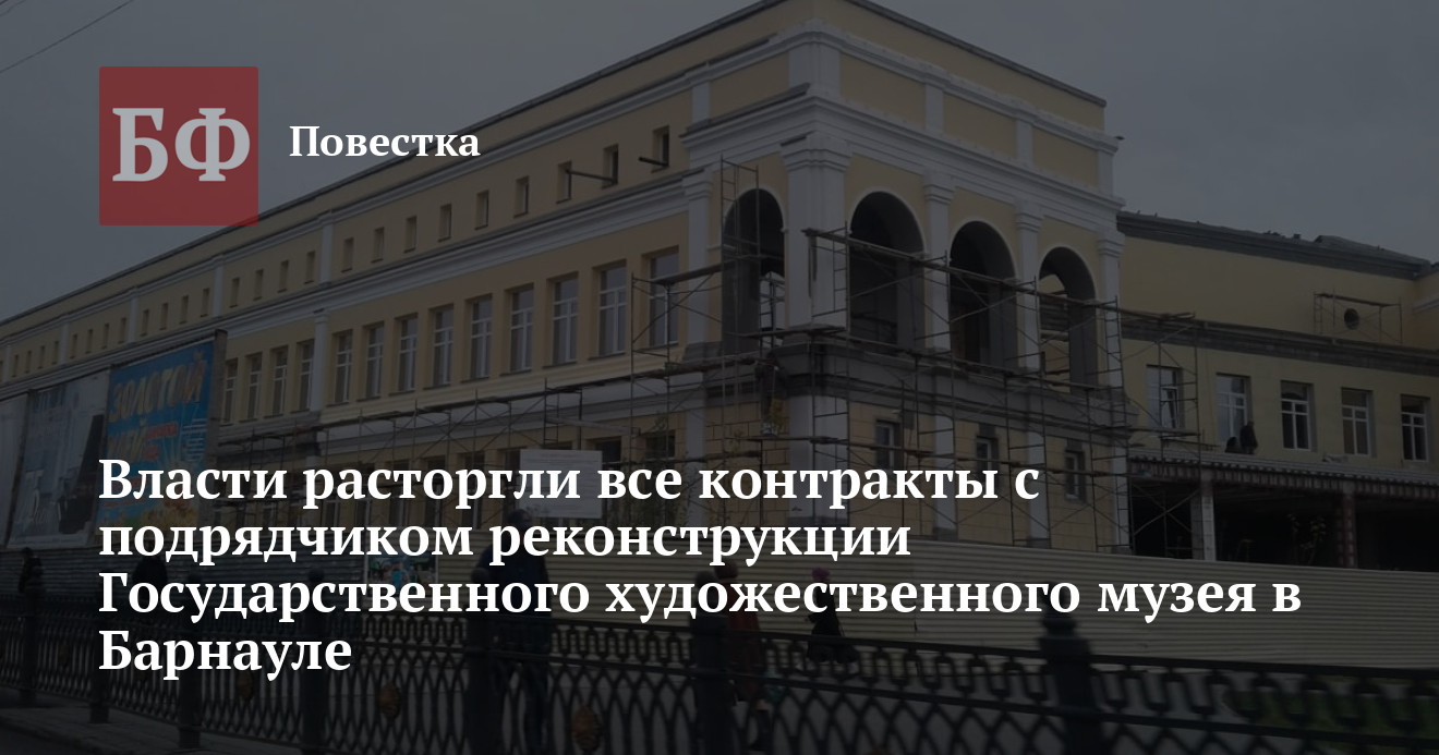 29 марта КГКУ «Единый стройзаказчик» подписало соглашение с ООО «Селф» о расторжении контракта, заключенного в 2018 году, по которому компания занималась завершением реконструкции Государственного художественного музея. Его цена составляла 646,4 млн рублей. Как следует из документа, подрядчик выполнил работ на 474,5 млн рублей.
