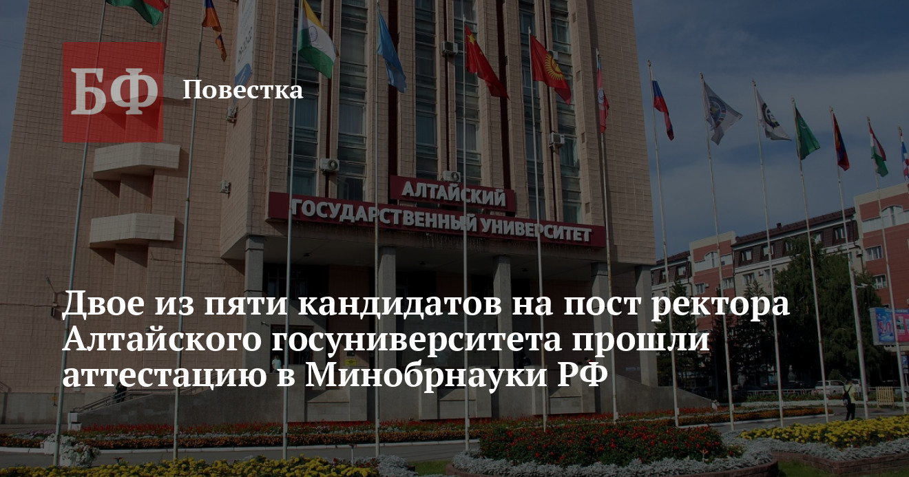 Как уже сообщалось, в вузе сформировался список из пяти претендентов на пост ректора. Структурные подразделения вуза выдвинули действующего ректора Сергея Бочарова, завкафедрой финансов и кредита МИЭМИС Степана Межова и директора колледжа АлтГУ Романа Ракитина. Затем со своим кандидатом определился институт гуманитарных наук, выдвинув руководителя Ларису Нехвядович. Позже всех поступили документы от директора Бийского филиала АлтГУ Сергея Малюкова.