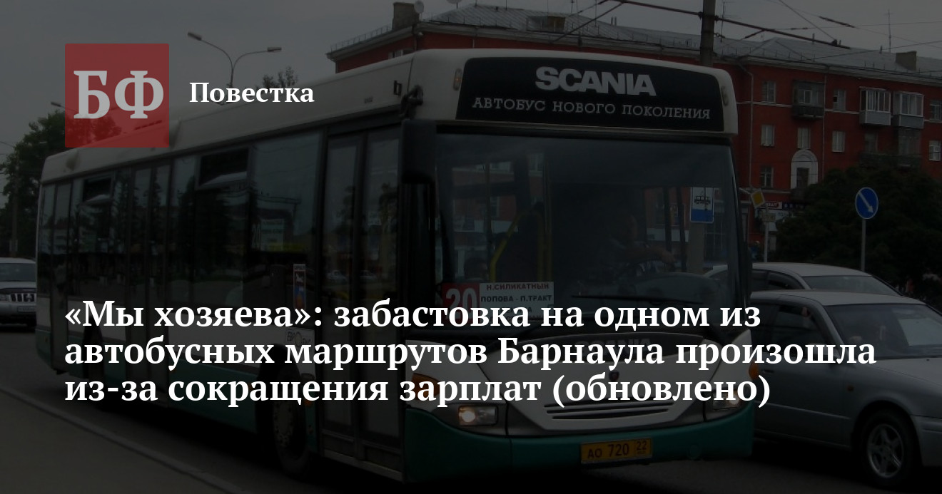 В Барнауле автобусный маршрут № 20 одновременно обслуживают ООО «Вега-транс» и ООО «Март-авто». С утра 6 мая (первый рейс начинается около 6:00) не вышли на линию экипажи второго перевозчика, то есть всего 12 автобусов, в то время как работники первого предприятия отправились в рейсы по расписанию. В «Март-авто» ИА «Банкфакс» объяснили действия сотрудников тем, что с 1 мая им сократили процент, получаемый с выручки в качестве зарплаты. Отметим, что с того же дня в Барнауле выросла стоимость проезда.