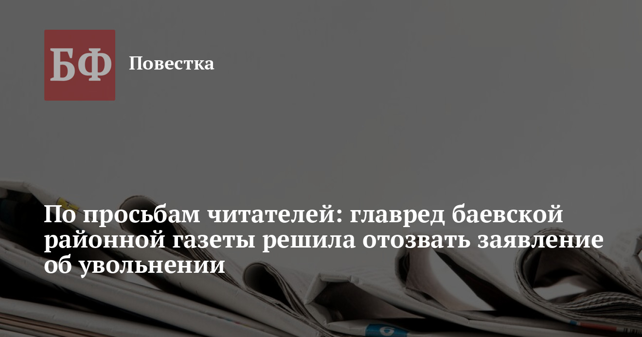 Главный редактор муниципальной газеты Баевского района «Голос хлебороба» Ирина Мерц отозвала заявление об увольнении по собственному желанию. В беседе с ИА «Банкфакс» она объяснила свое решение большой моральной поддержкой, которую ей оказали жители муниципалитета, и нежеланием их подводить.