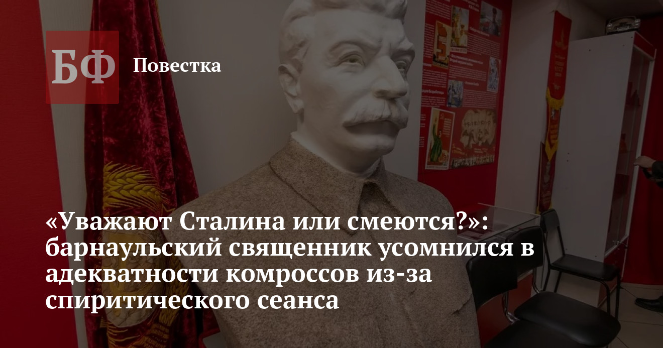 Ранее алтайские комроссы анонсировали реконструкцию спиритического сеанса в стиле одноименного рассказа Михаила Булгакова в своем «Сталин-центре» в Барнауле. В «Музейную ночь» они собираются вызвать дух отца народов. Эти планы вызвали весьма неоднозначный отклик, в том числе на федеральном уровне. Откликнулись даже люди, называющие себя экстрасенсами — затея комроссов пришлась им не по нраву. В свою очередь, своеобразным рупором духовенства выступил барнаульский священник Александр Микушин. 13 мая он опубликовал пост, в котором назвал анонсированное мероприятие бесовским шабашем и призвал христиан не приходить на сеанс. «Не участвуйте в делах тьмы. Не посещайте это оккультное мероприятие. Согласно Библии и канонам Русской православной церкви участие в данном мероприятии верующих, считающих себя православными, является недопустимым и духовно опасным. Это мерзость пред Богом», — написал Микушин, ссылаясь на определение Архиерейского собора. Цитирует священник также известных ученых и писателей, негативно относившихся к подобного рода сеансам.