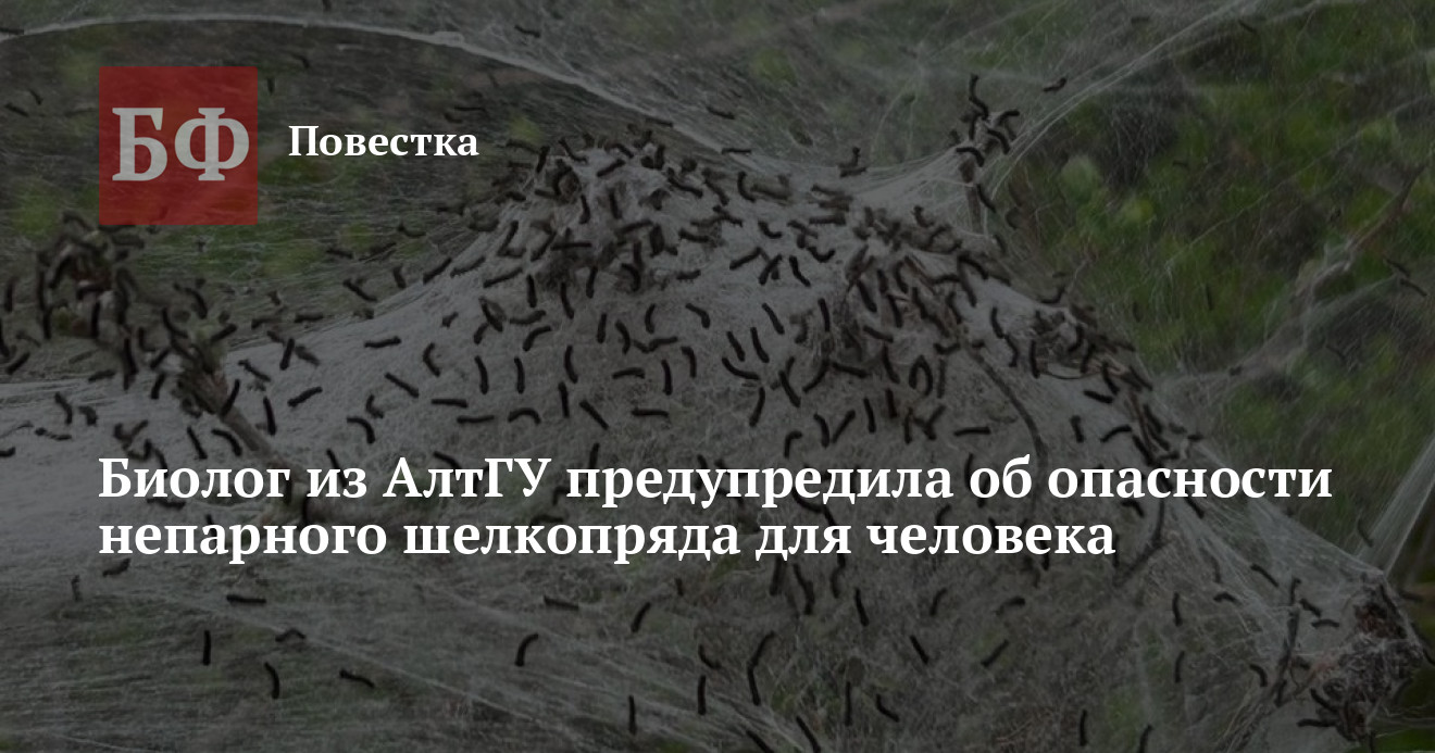 Доцент кафедры зоологии и физиологии Алтайского государственного университета, кандидат биологических наук Татьяна Антоненко рассказала об опасности, которую несет непарный шелкопряд для здоровья человека. Как сообщается на сайте АлтГУ, гусеницы насекомого могут вызвать аллергическую реакцию. Предположительно, именно этот вид шелкопряда сейчас расплодился в Чарышском округе, в том числе в населенных пунктах. Тем временем краевое Минприроды рекомендовало гражданам самостоятельно бороться с вредителями.