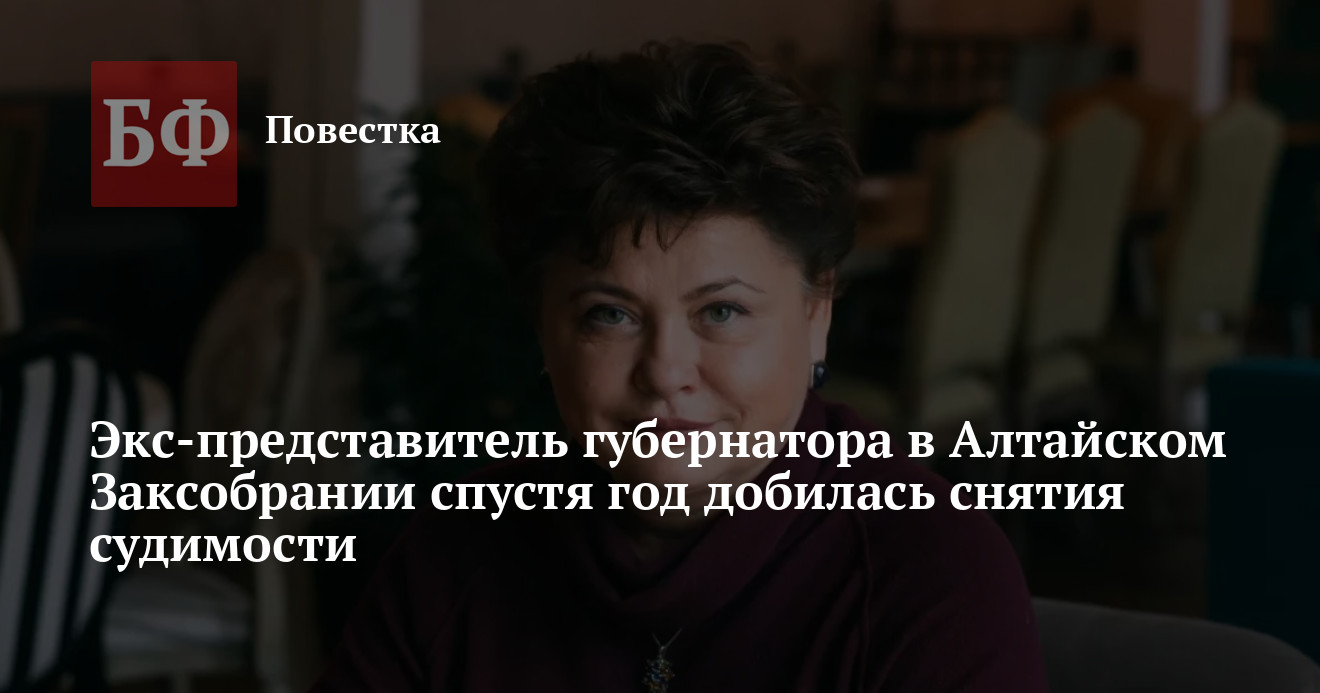 Центральный районный суд Барнаула удовлетворил ходатайство об отмене условного осуждения до истечения испытательного срока и о снятии судимости для бывшего представителя губернатора и правительства края в Алтайском Заксобрании Стеллы Штань, которая попалась на мошенничестве с госсубсидиями. Соответствующая запись есть на сайте суда. Отметим, что экс-чиновница и ранее предпринимала попытки избавиться о судимости, но до недавнего времени безуспешно.