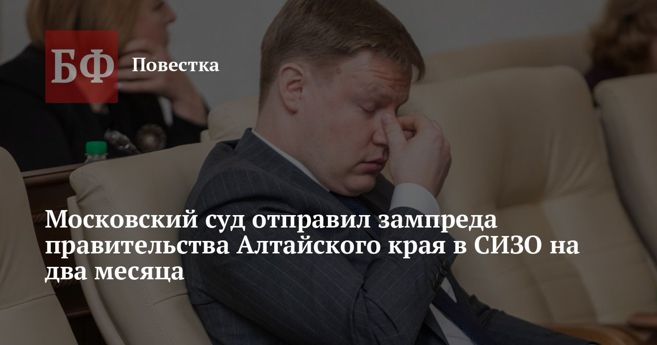 Лефортовский районный суд Москвы 17 мая назначил меру пресечения в отношении вице-губернатора Алтайского края Ивана Кибардина в виде заключения под стражу почти на два месяца. По сообщению пресс-службы судов общей юрисдикции Москвы, ему вменяют покушение на мошенничество в особо крупном размере.