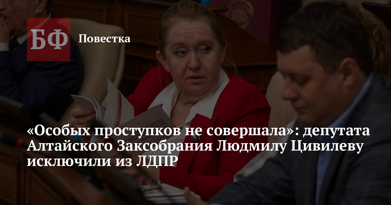 Региональное отделение ЛДПР исключило из своих рядов Людмилу Цивилеву, избранную от партии в Алтайское Заксобрание. О принятом решении, как сообщила депутат в беседе с «Банкфаксом», она узнала 28 мая, но остается в неведении по поводу причин. Координатор реготделения Сергей Булаев подтвердил агентству факт исключения Цивилевой, однако афишировать подробности не стал.