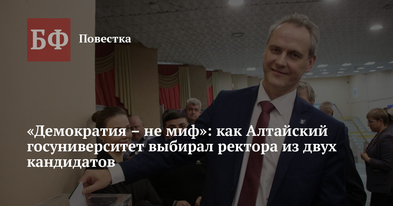 В Алтайском государственном университете 28 мая ректором вновь избрали Сергея Бочарова, который руководит вузом с 2019 года. Нельзя сказать, что у Бочарова была серьезная конкуренция — кроме него на выборах был только еще один кандидат — директор вузовского колледжа Роман Ракитин, сценарий с победой которого в вузе не обсуждали всерьез. Тем не менее «новый» ректор убежден, что процедура прошла в соответствии с демократическими принципами.