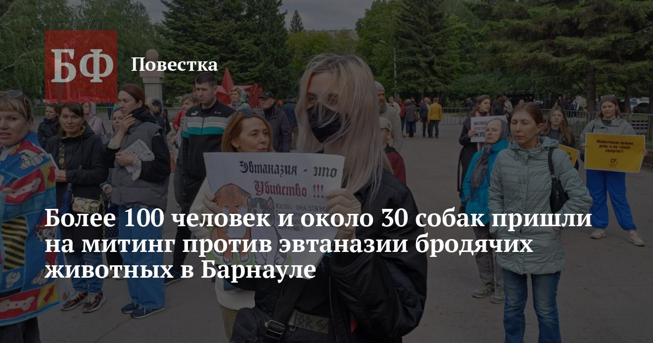 4 июня в Барнауле прошел митинг против законопроекта Алтайского Заксобрания, которым планируют разрешить умерщвление бездомных животных. Организатором мероприятия выступила депутат от «Справедливой России — За правду» Евгения Боровикова. Как сообщили «Банкфаксу» сотрудники полиции, на мероприятие пришло более 100 человек.