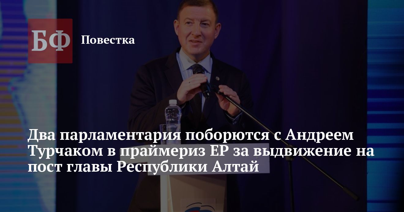 Андрей Турчак примет участие в праймериз «Единой России», по итогам которого партия определит претендента для выдвижения на выборы главы Республики Алтай. Как пишет ТАСС, конкуренцию ему составят сенатор и депутат регионального парламента.