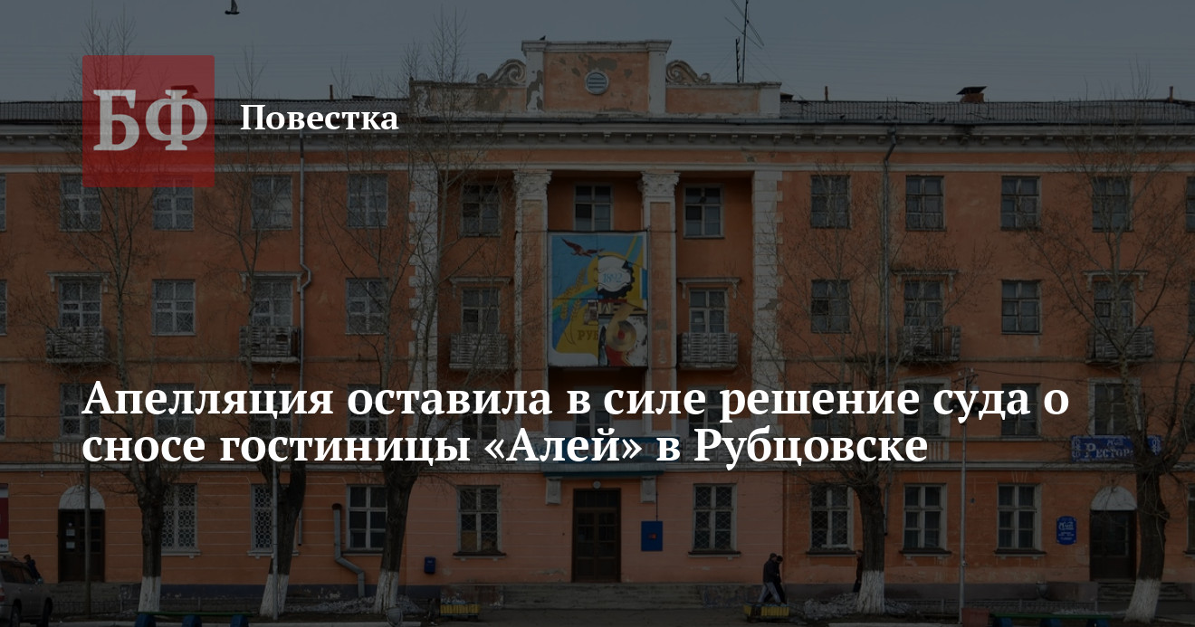 26 июня апелляционная инстанция рассмотрела решение Рубцовского городского суда о сносе гостиницы «Алей», вынесенное в феврале текущего года по иску прокуратуры к мэрии города и предпринимателю Андрею Медведеву, который владеет помещением магазина в здании. Их обязали снести аварийный объект до конца 2024 года. Алтайский краевой суд оставил данное решение без изменений.