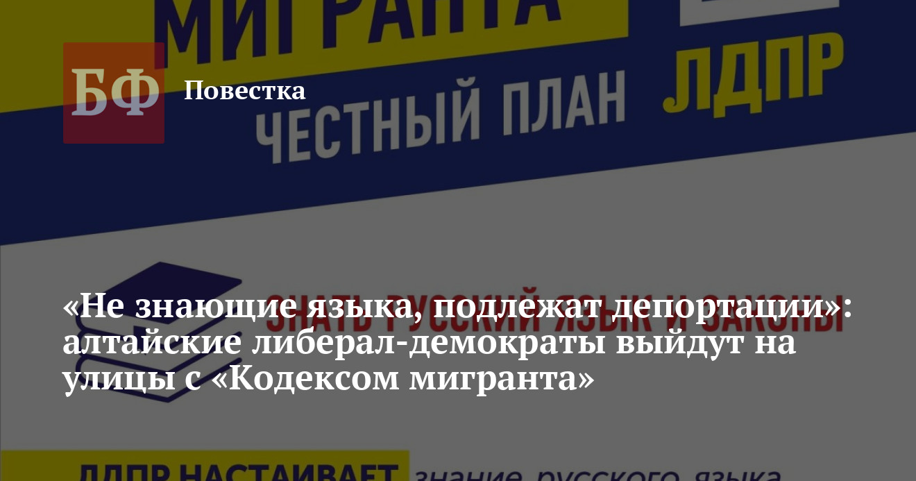 Представители ЛДПР будут распространять в Алтайском крае разработанный партией «Кодекс мигранта». Об этом сообщил «Банкфаксу» глава регионального отделения Сергей Булаев. По факту «Кодекс мигранта» представляет собой свод правил, которые предлагается соблюдать иностранным работникам и их семьям. Дополняют правила различные ремарки, в том числе в виде законодательных инициатив.