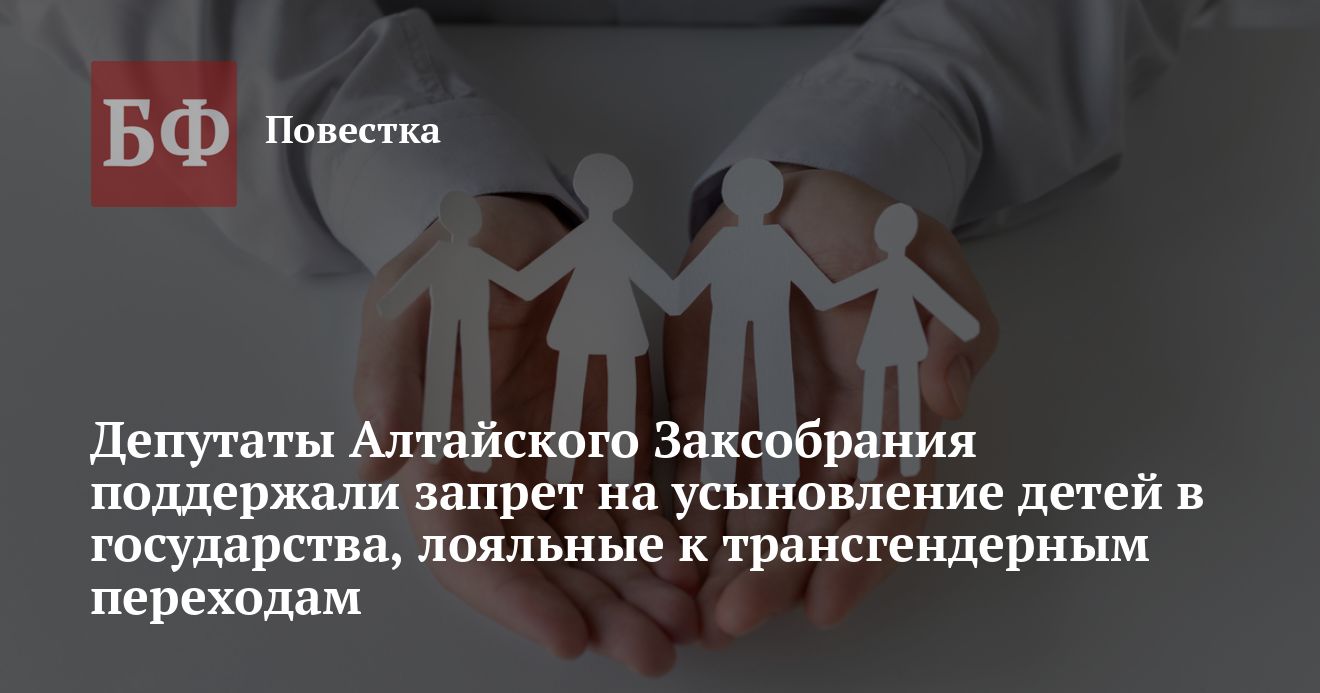 Алтайские депутаты единогласно поддержали федеральный законопроект о запрете усыновления детей из России гражданами государств, где разрешена смена пола. Об этом сообщила пресс-служба Алтайского краевого Законодательного Собрания.