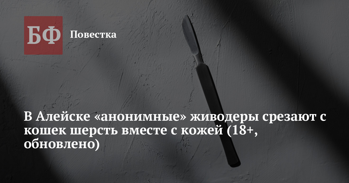 19 августа в Сети появилась публикация, в которой жительница Алейска по имени Валерия попросила придать огласке несколько случаев издевательства над животными, произошедших на улице Первомайская. По ее словам, неизвестные срезают с кошек кожу и поджигают их. Женщина приложила к публикации изображение, на котором видно, что у кота частично отсутствует шерсть, на боках проступает кровь, а местами вообще нет кожи. «На фото виден ровный срез, ни собака, ни другие коты такое сотворить не могут», — отмечает она. Алейчанка отвезла раненого кота в ветеринарную клинику, где ему обработали раны и пришили шкурку.