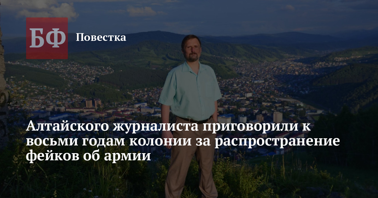 Учредитель и обозреватель еженедельника «Листок» Сергей Михайлов получил восемь лет колонии общего режима и лишился права работать в СМИ на четыре года за распространение ложной информации о действиях Вооруженных сил РФ в ходе проведения СВО. Об этом сообщило СУ СК по Республике Алтай.