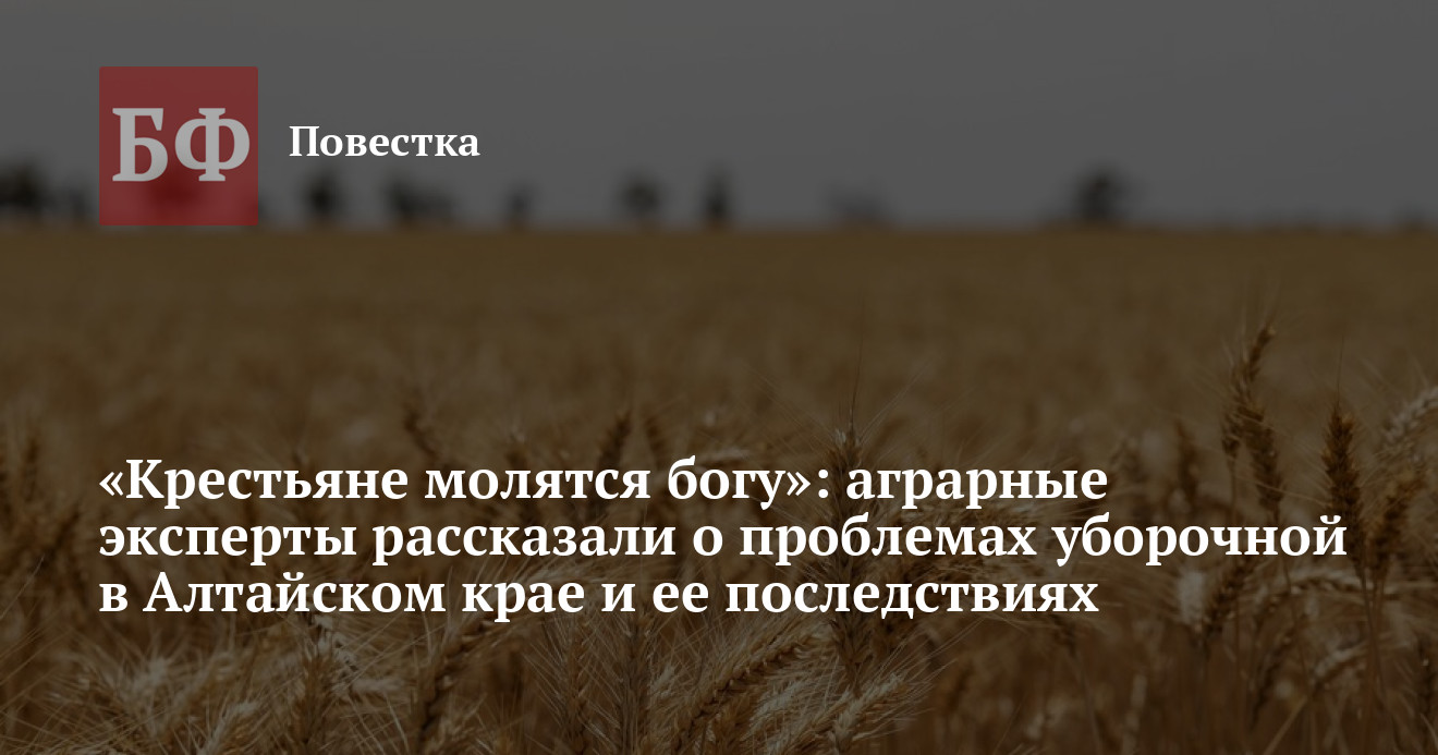 Председатель комитета Алтайского Заксобрания по аграрной политике, природопользованию и экологии Сергей Серов также рассказал, что уборочная кампания в крае проходит проблематично. По его словам, урожай вырос неплохой, но его залили дожди, поэтому растения прорастают на корню. При этом техника не может приступить к работе из-за переувлажненной почвы. «Мало того, мы не можем комбайном зайти в поле. То есть сегодня уже можно убирать, но тонут комбайны. Мучаемся. Естественно, есть потери урожая. Крестьяне молятся богу, чтобы погода постояла», — описал депутат актуальную обстановку.