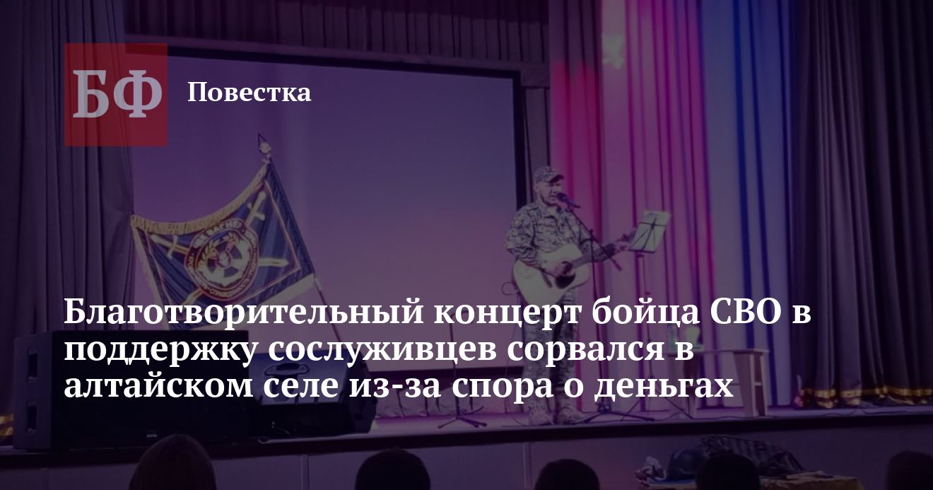 В селе Чарышское в начале сентября не удалось провести благотворительный концерт автора-исполнителя Ивана Пешеханова в поддержку участников специальной военной операции. Как сообщил певец в своем Telegram-канале, каждое его выступление нацелено на оказание помощи бойцам конкретного подразделения. Такого же принципа планировалось придерживаться при организации концерта в Чарыше, но Пешеханов не согласился с условием, якобы выдвинутым местными властями — отдать половину собранных средств участникам СВО из Чарышского округа.