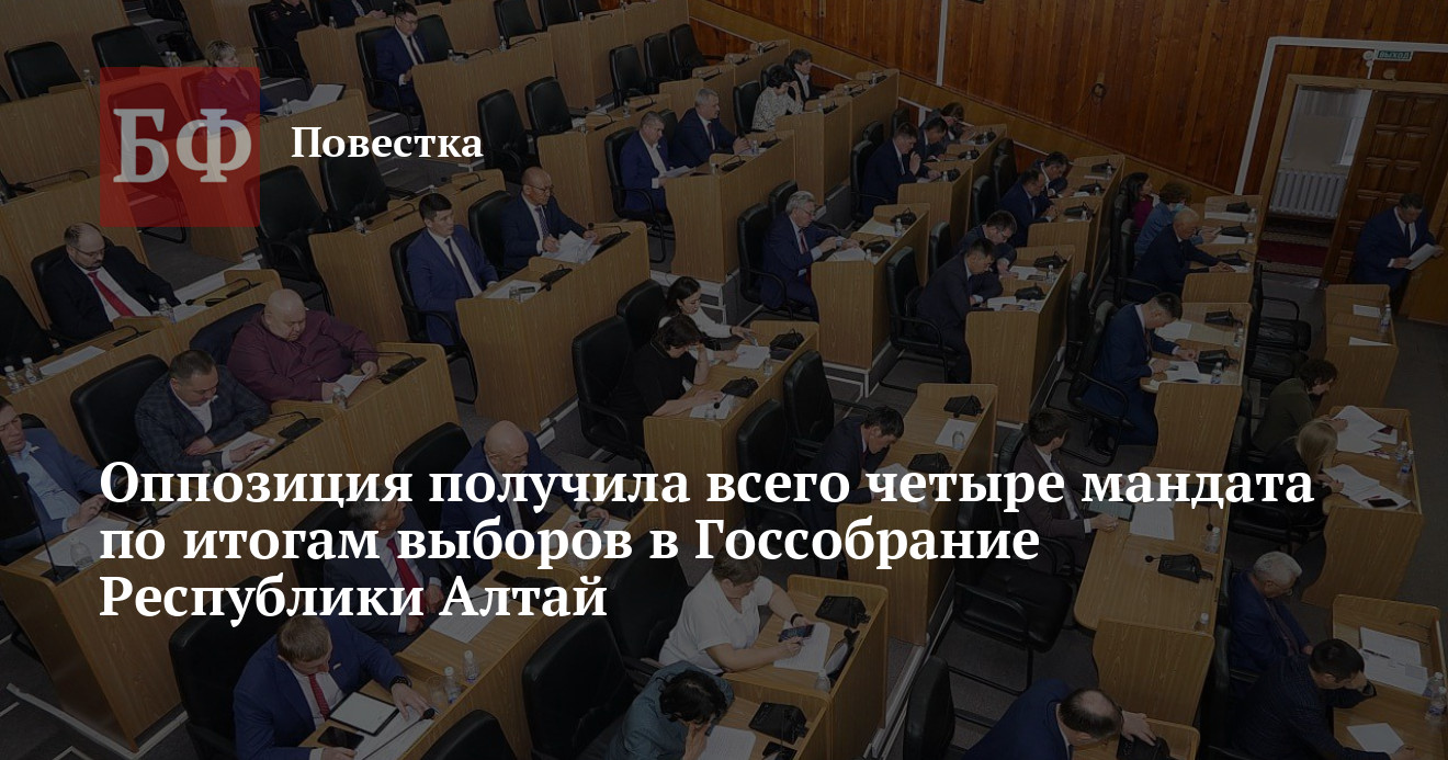 Представители оппозиционных партий получат четыре мандата в Госсобрании Республики Алтай по итогам выборов по единому избирательному округу. Об этом сообщил Избирком региона, который на заседании 13 сентября огласил результаты минувшей избирательной кампании.