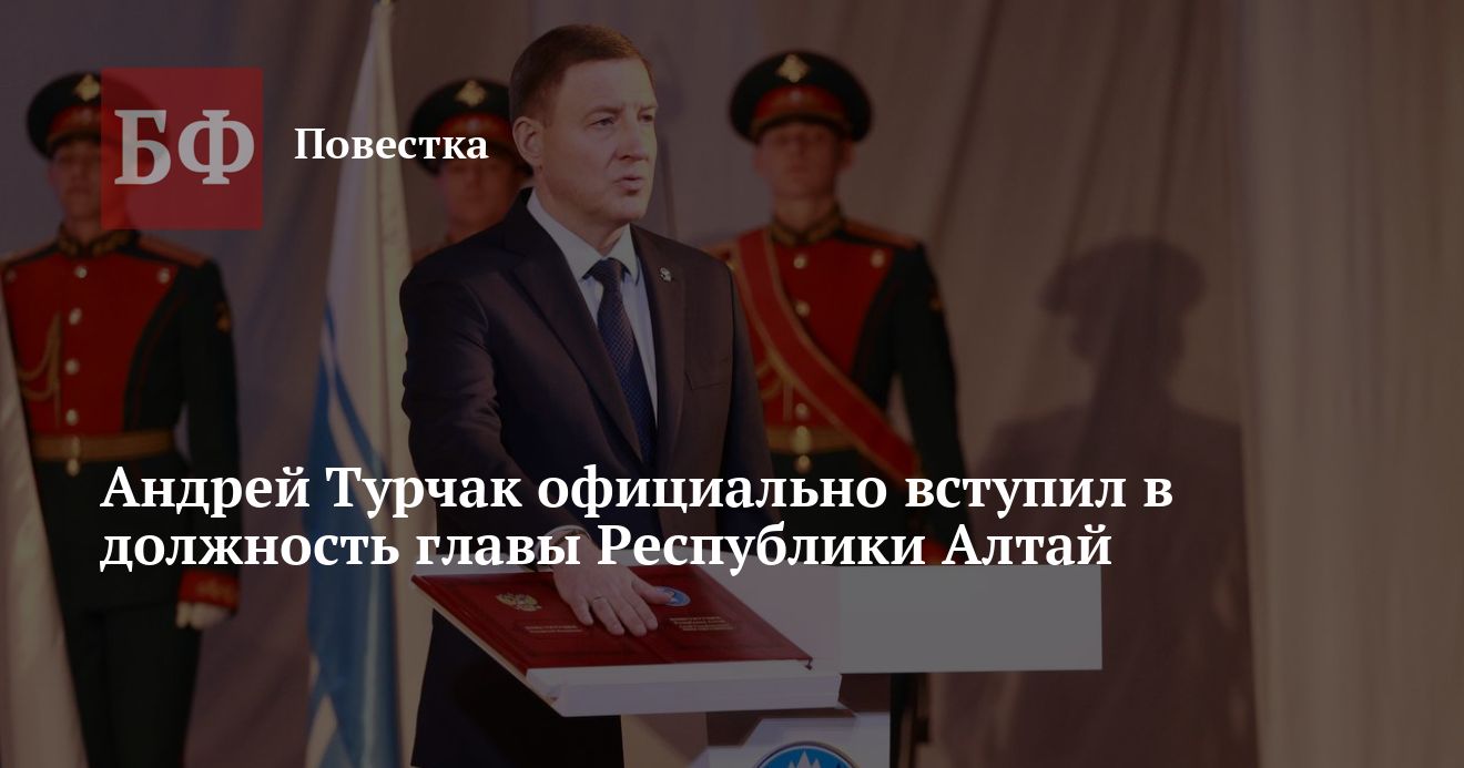 Церемонию открыл глава республиканского избиркома Дмитрий Степанов, который кратко доложил о результатах прошедших выборов. После него на сцену вышел Андрей Турчак, который принес присягу народу республики и Конституции. Он пояснил, что не стал зачитывать текст на алтайском языке, а попросил вывести его на экран, чтобы не искажать своим произношением. Турчак также поблагодарил избирателей за оказанное доверие, а президента РФ Владимира Путина — за поддержку в выдвижении на пост главы региона.