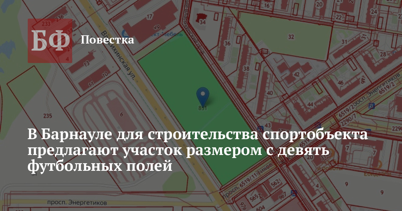 Сдаваемый в аренду участок расположен на пересечении улицы Власихинской и проспекта Энергетиков. Площадь надела — около 6,3 га, государственная собственность на него не разграничена. Срок аренды — 10 лет и восемь месяцев. Цель предоставления участка — для строительства спортивного объекта.