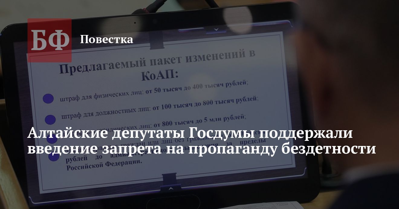 17 октября депутаты Госдумы в первом чтении приняли проекты законов о запрете пропаганды бездетности и введении административной ответственности за нарушение данного запрета. «За» проголосовали все присутствующие на заседании народные избранники, в том числе представители Алтайского края, следует из опубликованных на сайте ГД результатах голосования.