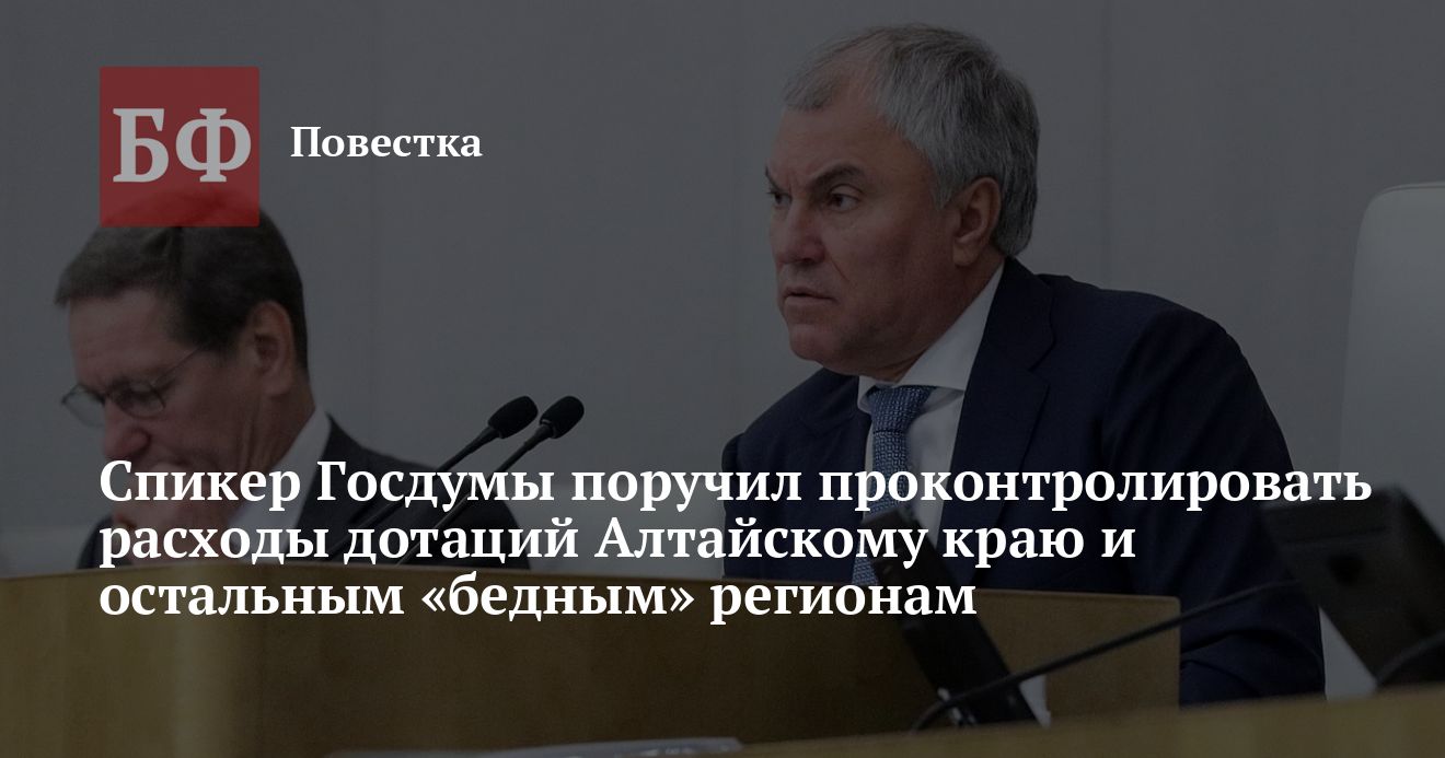 Председатель Госдумы Вячеслав Володин обозначил проблему при расходовании средств, которые выделят 10 малообеспеченным регионам, в том числе Алтайскому краю и Республике Алтай, на реализацию программ их развития. В ходе обсуждения проекта федерального бюджета на 2025−2027 годы он заявил, что в ряде субъектов дополнительные деньги хотят потратить не на решение проблем людей, в связи с чем спикер поручил взять эти расходы на парламентский контроль.