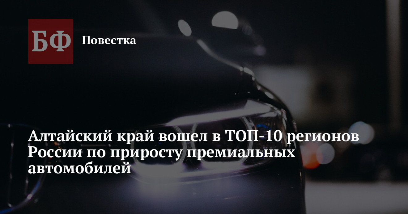По относительному росту числа элитных машин Алтайский край вошел ТОП-10 регионов России. Первая тройка десятки включает Москву (плюс 1627 машин), Московскую область (плюс 323) и Свердловскую область (плюс 181), а последняя тройка — Санкт-Петербург (плюс 104), Приморский край (плюс 83) и Алтайский край (плюс 71).