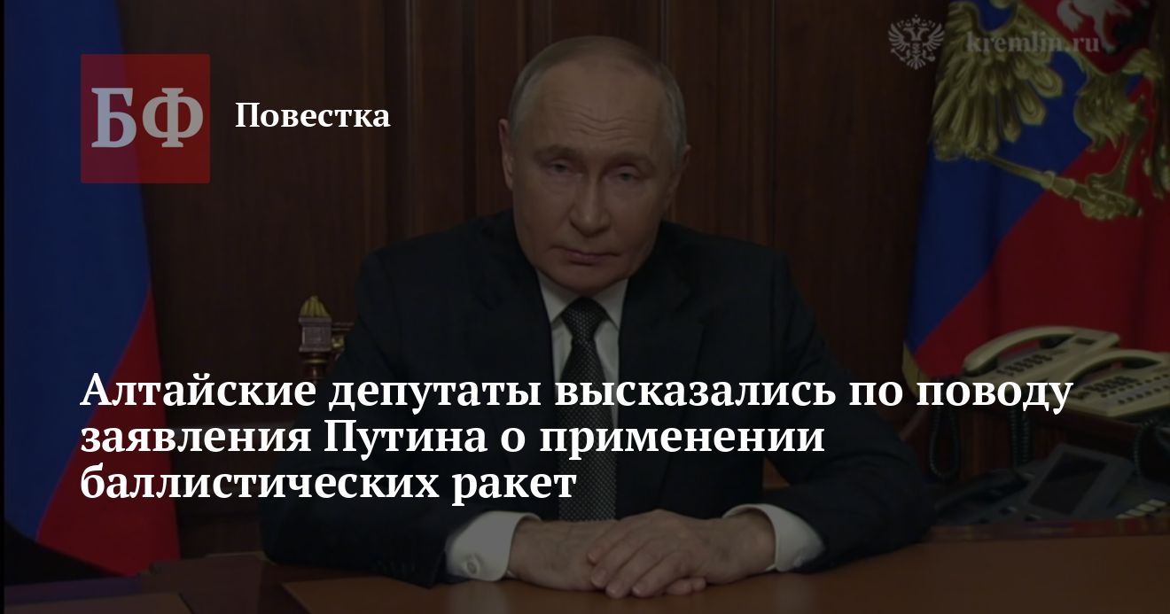 Депутат Алтайского Заксобрания и лидер «Коммунистов России» Сергей Малинкович назвал историческим обращение президента страны, в котором он заявил о применении баллистических ракет в конфликте с Украиной. По данному поводу также высказались депутат Госдумы от Алтайского края Даниил Бессарабов и уроженка региона Мария Бутина — в Госдуме она представляет Кировскую область.