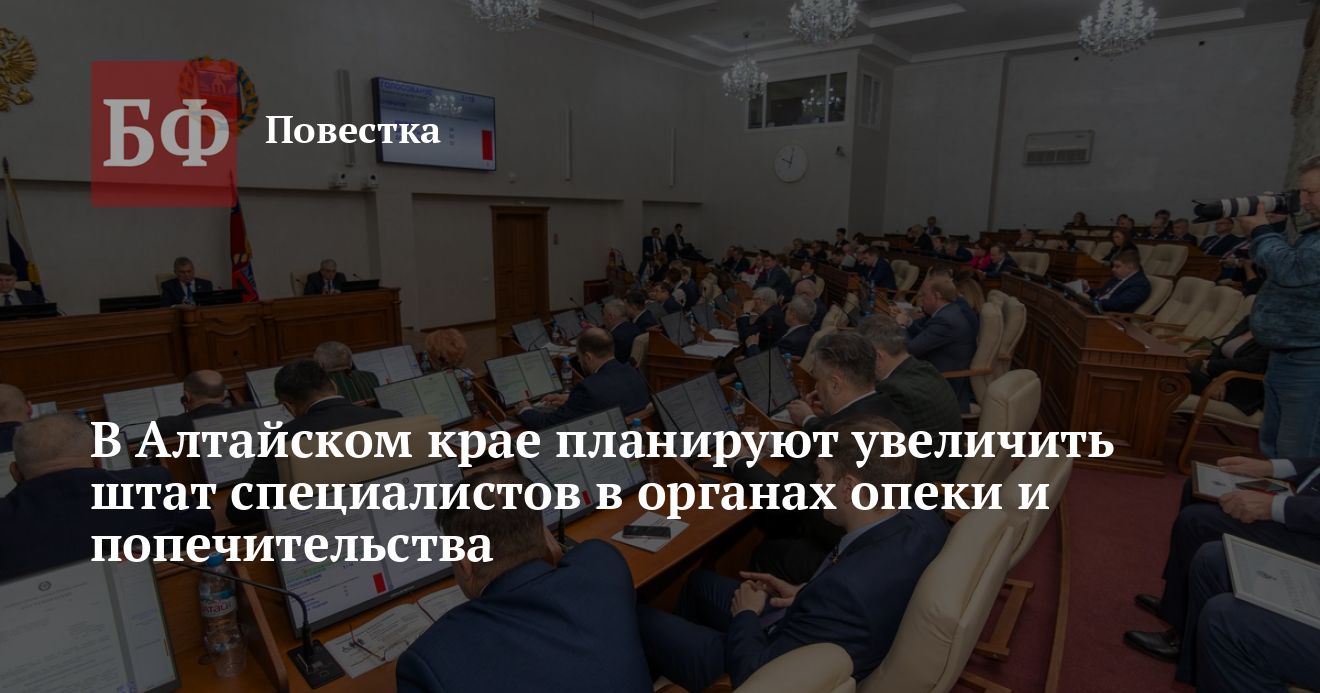 На предстоящей сессии Алтайского Заксобрания рассмотрят законопроект, который предполагает увеличение штата специалистов в органах опеки и попечительства. Изменения должны коснуться муниципалитетов, где в органах опеки сейчас работает только один сотрудник. Также депутаты во втором чтении рассмотрят законопроекты о краевом бюджета на 2025 год, о новых налоговых льготах и т. д., следует из опубликованной на сайте парламента повестки.