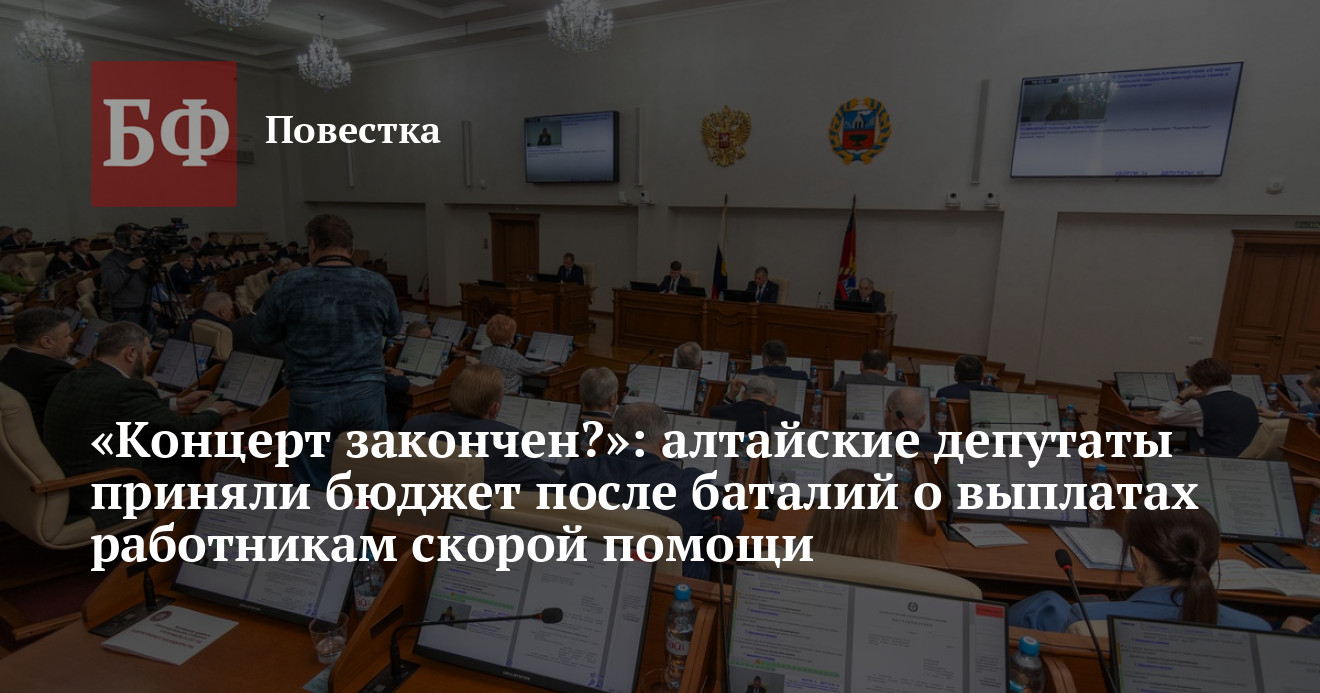 И подвел черту под столь продолжительной полемикой Александр Романенко: «Коллеги, в заключении дополнение. Еще раз: проблема социальных выплат работникам скорой помощи в Алтайском крае будет решена. Но давайте действовать по порядку. Мы уже договорились: мы повторно обращаемся в федеральные органы власти для решения этого вопроса на федеральном уровне, и я уверен, что нас услышат. Но даже в случае, если нас не услышат, мы это решением примем в Алтайском крае. <…> И рассмотрение этого вопроса я никак бы не связывал с рассмотрением проекта бюджета на 2025 года». В результате 46 депутатов из 63 присутствующих проголосовали за принятие закона о бюджете во втором чтении, а 17 воздержались.