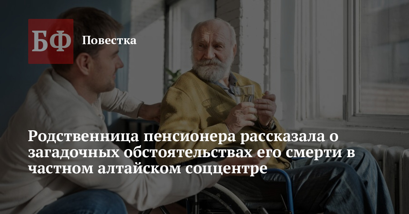Юлия Казакова рассказала, что ее 72-летний дядя Дмитрий Петров скончался в социальном центре «Рубикон» при загадочных обстоятельствах в августе этого года. По ее словам, в молодости он работал на золотодобыче на севере и часто находился в разъездах, после выхода на пенсию мужчина какое-то время жил у ее сестры в Республике Алтай. Когда женщина заболела сама и потеряла возможность ухаживать за пенсионером, его направили в местный дом престарелых в Горно-Алтайске, где он проживал несколько лет до 2023 года.