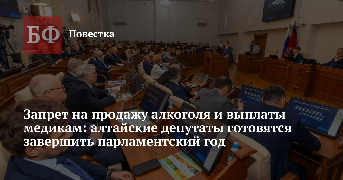 12 декабря состоится 36-я сессия депутатов Алтайского Заксобрания 8-го созыва, которая станет последней в уходящем году. Традиционно предновогодняя встреча алтайских парламентариев не сулит принятия спорных законопроектов, вокруг которых могли бы возникнуть острые дебаты. Тем не менее депутатам предстоит рассмотреть инициативы по запрету розничной продажи алкоголя в жилых домах, а также обращения к правительству РФ по вопросам увеличения выплат работникам скорой помощи и расчистке лесов.