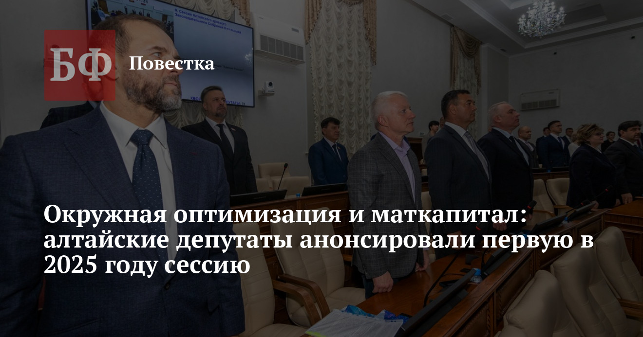 30 января состоится 37-я сессия депутатов Алтайского краевого Законодательного Собрания восьмого созыва, которая станет первой в наступившем году. Согласно повестке, опубликованной на сайте парламентского центра, народным избранникам предстоит рассмотреть внесение изменений в краевой закон об обороте земель сельхозназначения, использование остаточных средств регионального маткапитала, объединение поселений Солонешенского района в муниципальный округ, назначение детского омбудсмена и ряд других. Судя по анонсу, горячих споров и жарких дискуссий в январе в АКЗС ждать не стоит. Впрочем, разногласие среди политиков может вызвать очередное назначение Ольги Казанцевой на пост уполномоченного по правам ребенка, как это было четыре года назад, когда депутаты упрекнули ее в недостатке эмпатии.