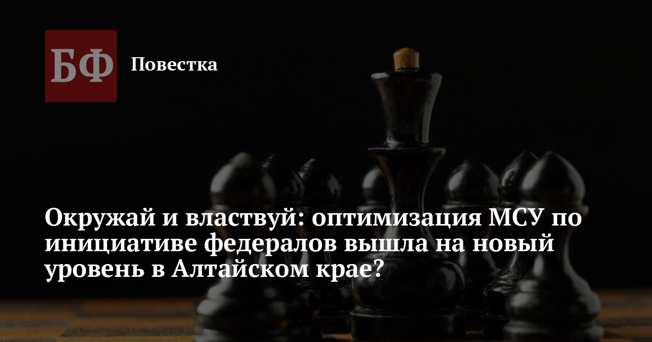 В Алтайском крае, как и в других регионах России, ведется преобразование муниципальных районов в одноуровневую систему органов местного самоуправления. Это делается в целях оптимизации и предполагает объединение всех сельсоветов в единый округ с централизацией власти и процессов управления в окружной администрации. Такое укрупнение влечет за собой упразднение исполнительных и представительных органов сельских поселений в МО. При этом в селах формируют филиал окружной администрации с ограниченным количеством сотрудников или назначают старосту.