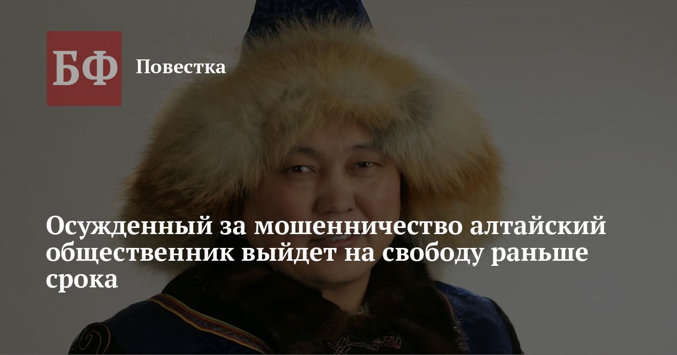 Общественный деятель из Республики Алтай Акай Кине, также известный как Сергей Кыныев или Кине-Теелесдьетиас Айкам Ким Уулы, который в марте прошлого года был осужден на шесть лет колонии за мошенничество, уже в этом году выйдет на свободу. Общественнику удалось смягчить приговор и вдвое сократить срок своего пребывания под стражей, сообщили «Банкфаксу» в пресс-службе Московского областного суда. Данную информацию в телефонном разговоре редакции также подтвердил сын Акая Кине.